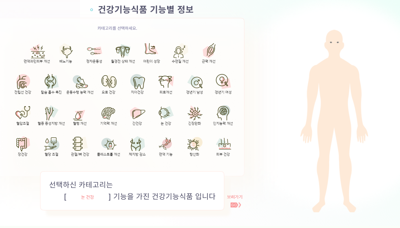 선택한 카테고리는 ' ' 기능을 가진 건강기능식품이라는 문구와 함께 이미지를 볼 수 있습니다.