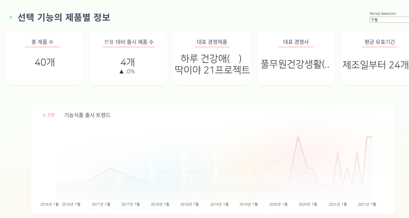 소개 : 건강기능식품 산업의 성장과 함께 다양한 건기식을 찾는 현대인들! 많은 회사에서 다양한 브랜드들이 쏟아져나오는 지금, “우리 회사만의 경쟁력”을 갖출 수 있는 방향성을 제시해주는 “건기식업체 컨설팅 대시보드”를 제작합니다. “몸에 좋다니까” 일단 먹고 보는 소비자들에게, “진짜 나에게 필요한” 건기식을 제공해줄 수 있는 회사는 우리뿐! 다양한 제품들의 기능별/성분별 종합정보를 제공합니다.
