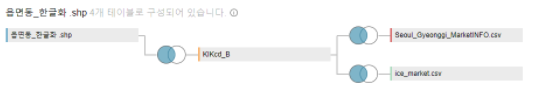 - 데이터가 이렇게 연결되어 있는 상태에서 Seoul_Gyeonggi_MarketINFO.csv와 Ice_market.csv를 공간조인하려고 했는데 안됐습니다. (Buffer와 Makepoint) 이유를 모르겠어요ㅠ 이게 가능했으면 무인 매장 반경으로 슈퍼, 편의점이 몇개있는지 알 수 있었을 텐데 아쉬웠습니다.