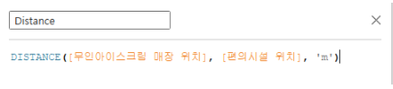 Distance함수를 써서 무인아이스크림 매장과 편의시설(편의점, 슈퍼마켓)의 거리를 구합니다.