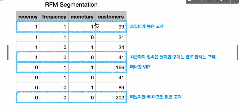 ex) 쿠팡 같이 생필품을 판매하는 플랫폼의 경우 한 달 이내 구매가 없을 때 이미 Recency가 떨어지는 고객으로 분류할 수 있지만 29cm 같이 고급화 전략을 쓰고 있는 플랫폼에 Recency 만점 기준을 한 달 기준으로 세우면 너무 타이트하다.
