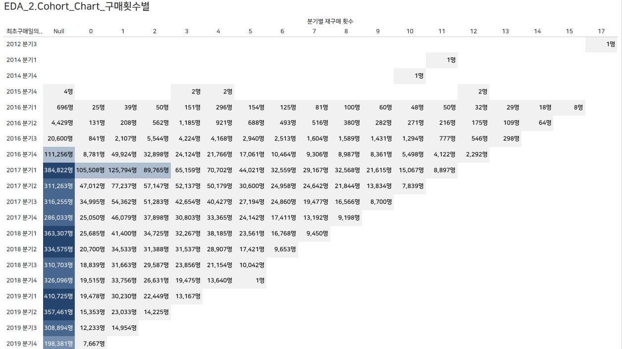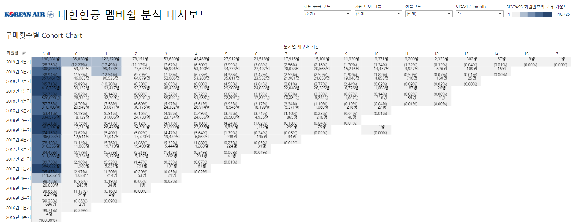 - 코호트차트를 통해 항공권을 구매한 고객이 얼마만에 구입한 고객인지 파악가능하게 만들고 싶었음.