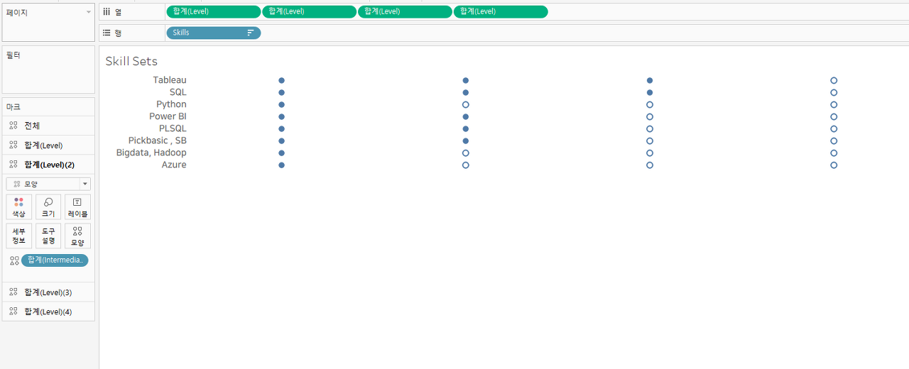 각 스킬 레벨을 열로 올려주고 모양으로 설정해주면 0 또는 1에 따라 비어있는 원, 채워있는 1로 나타나진다.