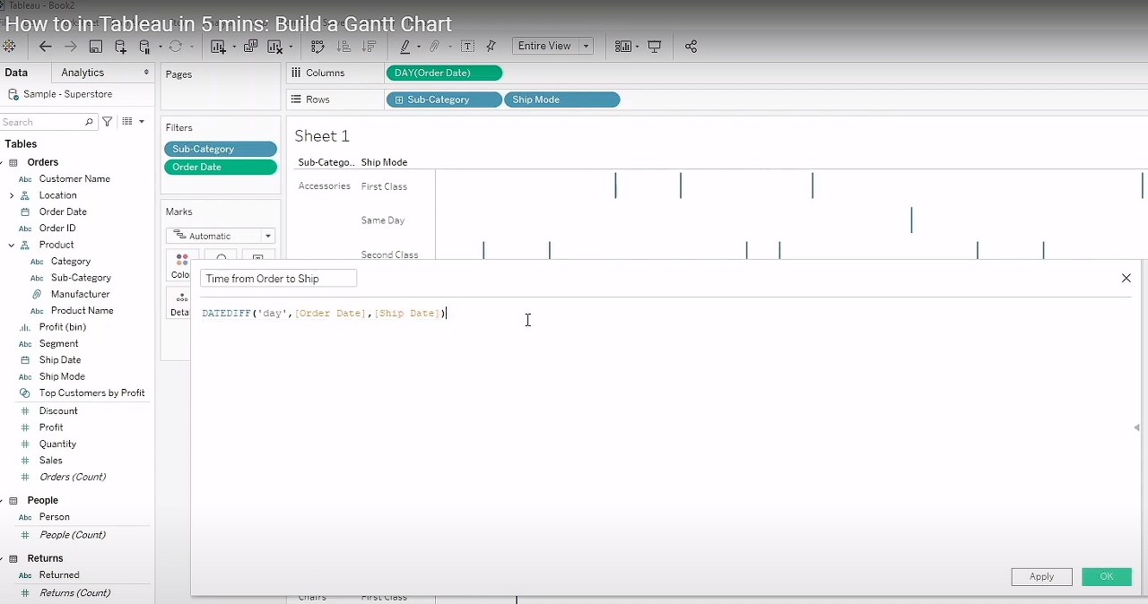 참고 링크 : https://www.youtube.com/watch?v=BIwB2ycDDIo , How to in Tableau in 5 mins: Build a Gantt Chart
