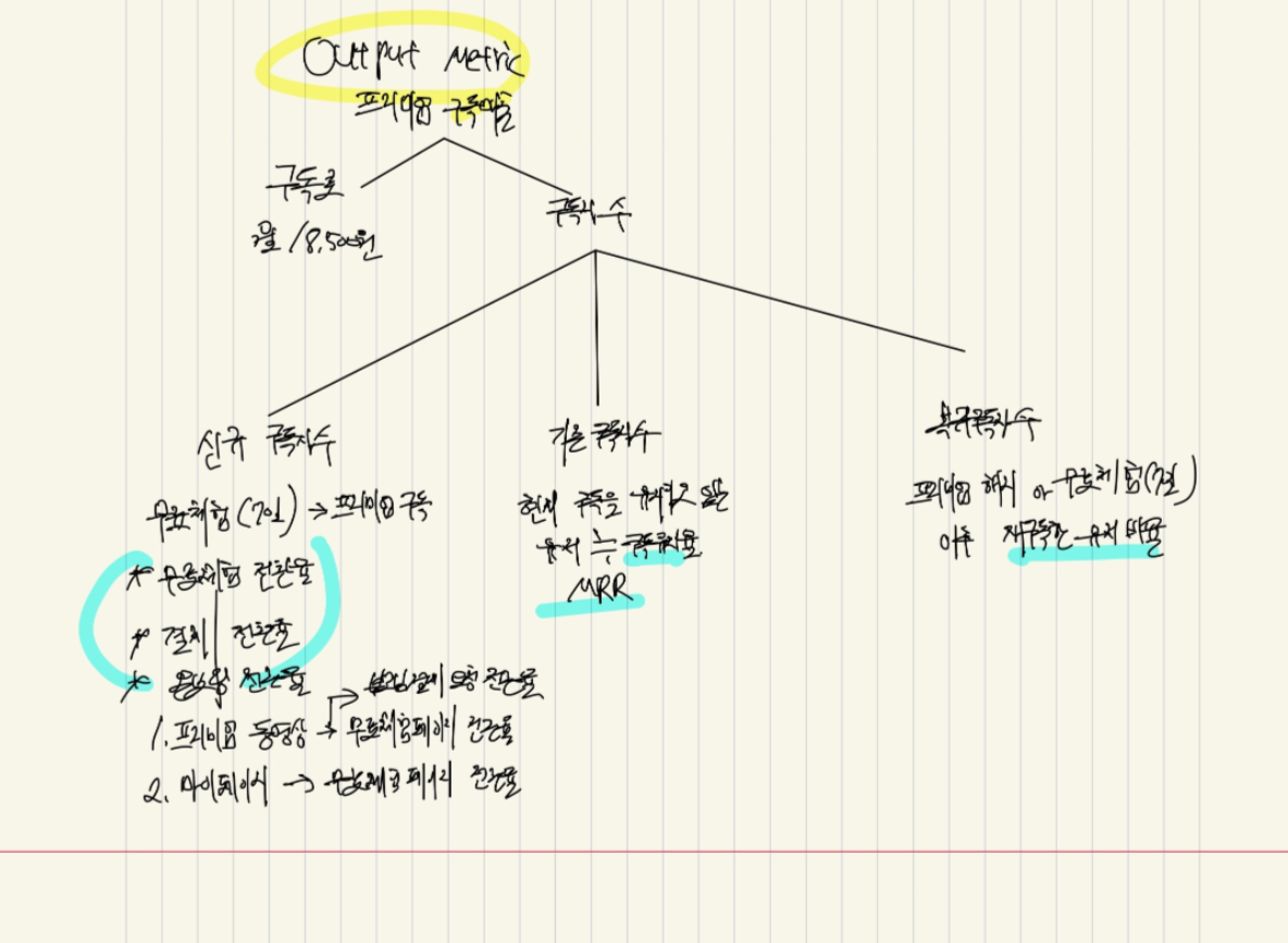 - ์ ์ ํ๋ก์ฐ๋ฅผ ๋ฐํ์ผ๋ก, ์ฝด๋ค ํ๋ฆฌ๋ฏธ์์ ๋งค์ถ์ด๋ผ๋ Output metric ์ ๋ ์ ์ดํดํ ์ ์๊ฒ ๋์ ์ฃผ๋ ํ์ Metric ๋ค์ ์ ์ํ๊ณ , ๊ทธ ๋ค์ Hierarchy ๋ฅผ ๊ตฌ์ฑํ๊ณ , ๊ทธ ์ค ์ด๋ ๊ฒ๋ค์ด Input metric ์ธ์ง ์ ์ํด๋ณด์! (ํ๋๊ฐ ์๋ ๋ค์)