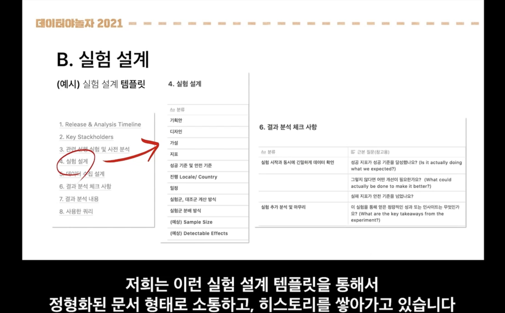 각 조직별로 중요하게 생각하는 KPI들이 있을텐데 이를 도출하기위해 실험설계 템플릿 만들어서 문서 형태로 전사에 공유하고 피드백받는 것들이 인상깊었다. 답정너가 아닌 효율적인 업무 방식.