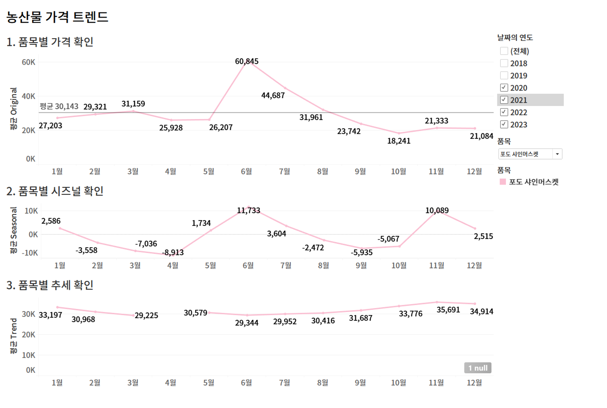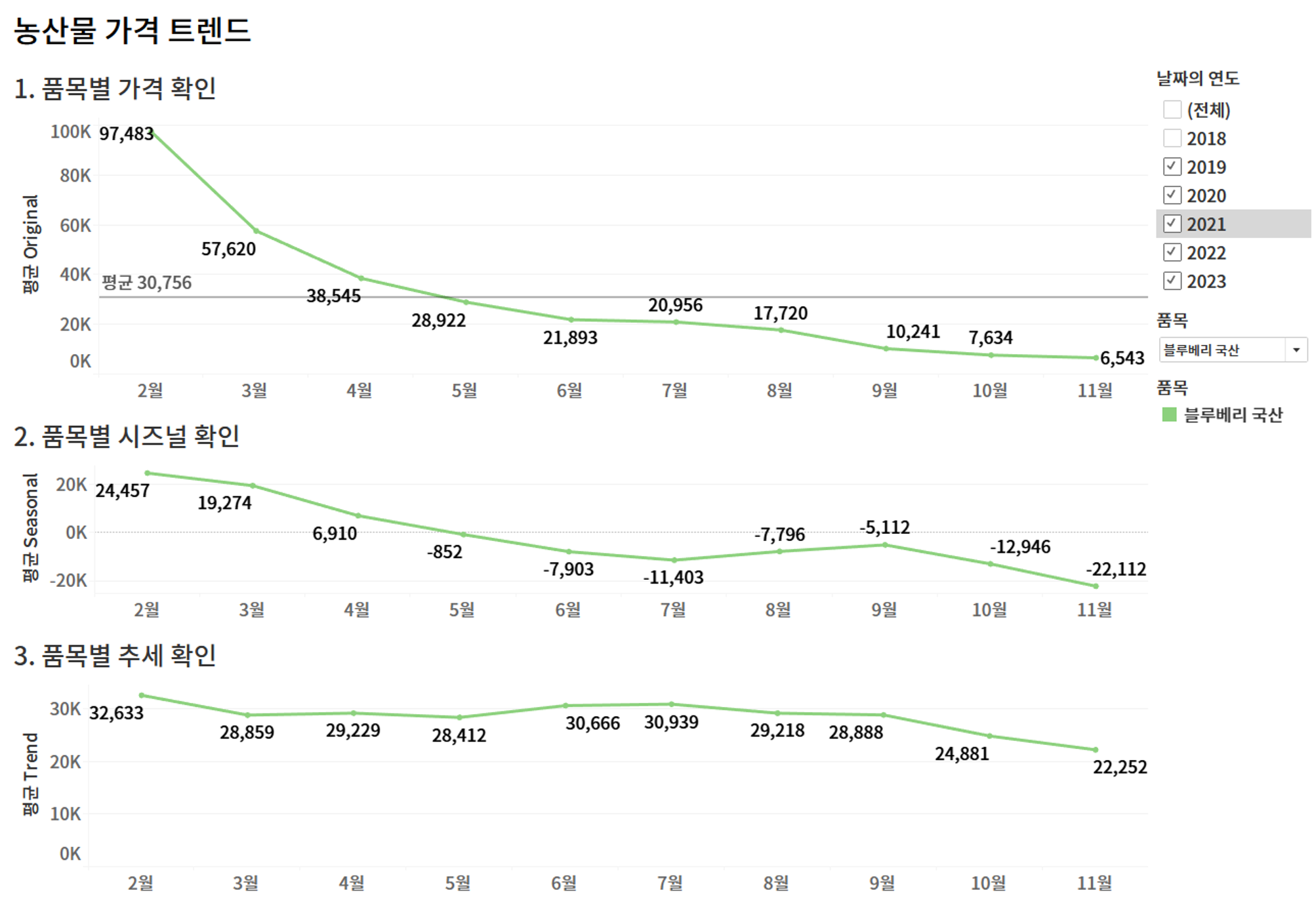 또한 현업 담당자가 활용할 수 있는 농산물 가격 트렌드 대시보드를 제공하여 추가 분석을 진행할 수 있습니다.