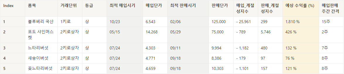 품목별로 최적의 매입/판매 시기를 확인할 수 있고 예상 수익률을 알 수 있습니다.