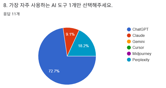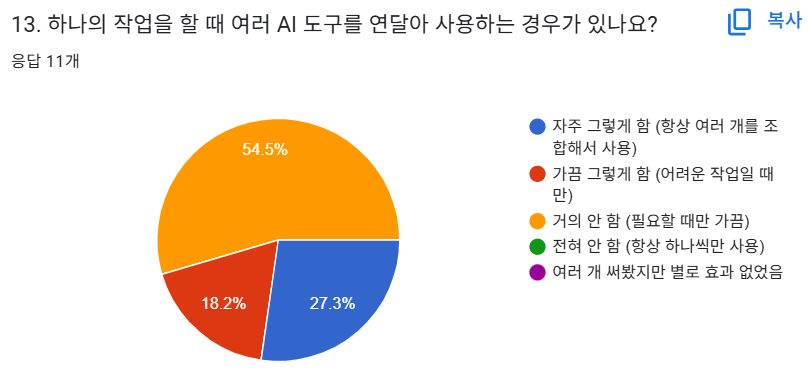 여러 도구를 연달아 사용에 대한 질문에서는 54.5%가 "거의 안 함"이라고 답했고, 27.3%만이 "자주 그렇게 함"이라고 응답했습니다. 이는 다양하게 AI를 쓰는 것보다는 AI 툴 하나에 집중하는 전략이 더 일반적임을 보여주는데요. 챗지피티 하나로 다양하게 활용하시는 것 같습니다.