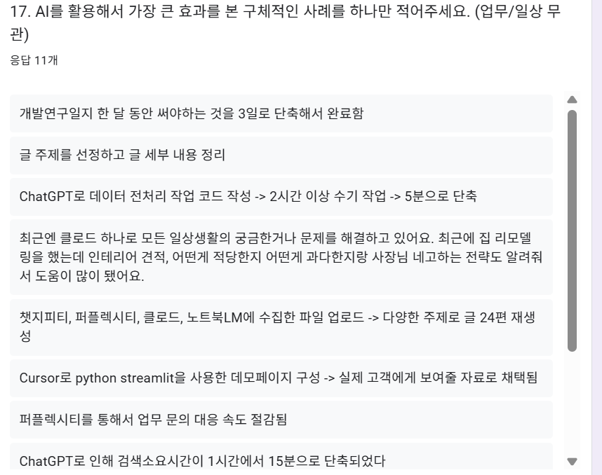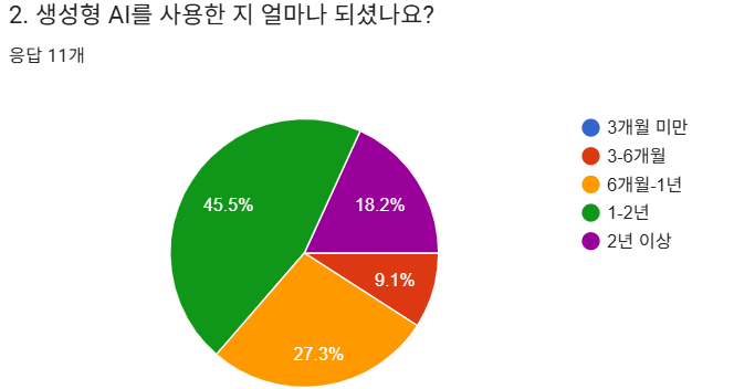 AI 사용 기간은 1-2년이 가장 많았는데, 이는 2024년 하반기 ChatGPT 대중화 시점과 일치하는 것으로 보입니다.