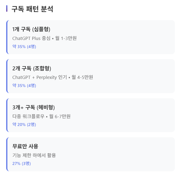 조합형 (35%): ChatGPT + Perplexity와 같은 2개 서비스 조합으로 월 4-5만원을 지출하는 유형입니다. "ChatGPT + 1개 추가" 패턴이 가장 일반적인 것으로 나타났습니다.